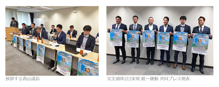建設産労懇では毎年6月と11月に「完全週休2日実現 統一運動」に取り組んでいます。各構成組織の代表が今年6月の閉所結果を報告するとともに、「週休2日はあたりまえ!休んでこそのモチベーション!」をキャッチフレーズに、11月の統一運動に関する運動方針やポスターを紹介する共同プレス発表を行いました。