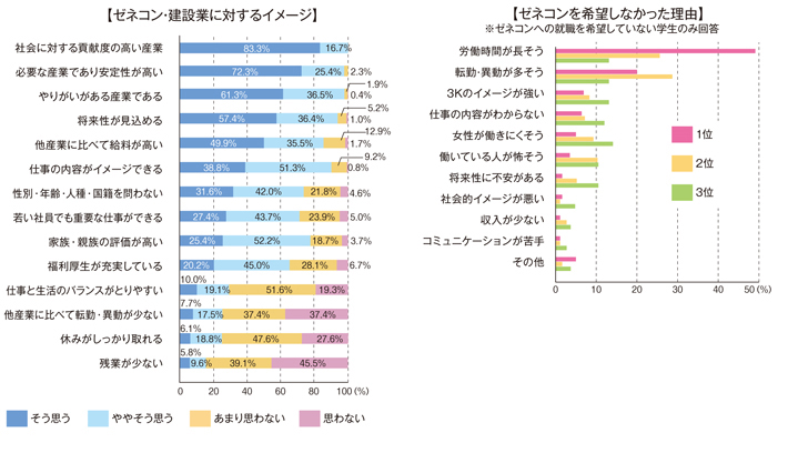 ゼネコン・建設産業が「社会に対する貢献度の高い産業」であると思うかについては『そう思う』『ややそう思う』という回答が100%という結果になった一方、ゼネコンへの就職を希望しなかった理由について聞いたところ、約半数の学生が1位に「労働時間が長そう」と回答しました。近年建設業界においても働き方改革が進んでいることをもっと積極的にアピールしていく必要がありそうです。