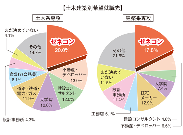 昨年度に引き続き、今年度も学生たちの希望就職先として「ゼネコン」が首位となりました。とはいえ全体割合としては土木系が20.0%、建築系が17.8%と決して高くはない数値となっています。