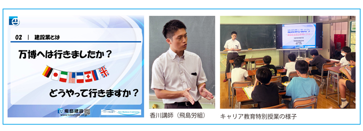 「建設業と私たち」をテーマに、大阪・関西万博やディズニーランドなど身近なテーマを織り交ぜながら、土木と建築の違いや社会インフラづくりの重要性など建設業の基本的な情報と魅力を分かりやすく説明しました。