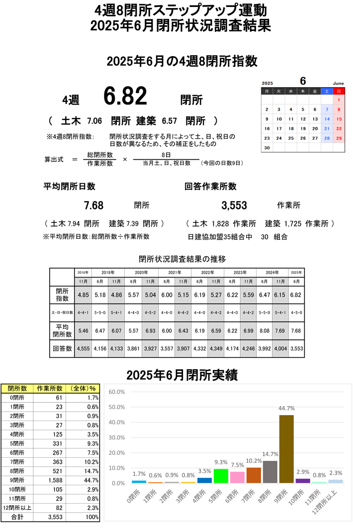 2025年9月26日 / Last updated : 2025年9月26日 nikkenkyo 4週8閉所時短・働き方改革2025年6月 4週8閉所ステップアップ運動集計結果 PDFはこちら。 関連記事2024年11月 4週8閉所ステップアップ運動ポスター2024年 4週8閉所ステップアップ運動のキャッチフレーズ大募集 !NikkenkyoNews Vol.32 「4週8閉所ステップアップ運動」各労働局に協力要請2023年4週8閉所ステップアップ運動 キャッチフレーズ決定!2023年 4週8閉所ステップアップ運動のキャッチフレーズ大募集 !NikkenkyoNews vol.38 「4週8閉所ステップアップ運動」各労働局に協力要請2021年11月 4週8閉所ステップアップポスター・安全衛生協議会用資料・取り組みチェックシート2021年4週8閉所ステップアップ運動キャッチフレーズ決定!