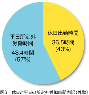 図3は、所定外労働時間の内訳です。85時間のうち平日残業時間が48時間、休日出勤時間が37時間となっています。