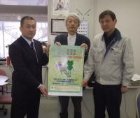 宮本執行委員長(写真中央)、浅井建設支部長(写真右)にポスターを手渡す日建協佐藤副議長(写真左)