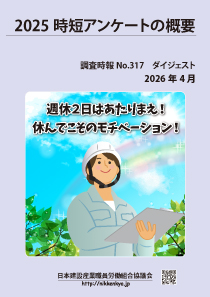 2026年4月21日 / Last updated : 2026年4月21日 nikkenkyo 時短・働き方改革時短アンケートdigest最近の発刊物2025時短アンケートダイジェスト発刊2025年 時短アンケートダイジェストを発刊しました。「日建協時短アンケート」は、1972年の調査開始以来、50年以上にわたり建設産業で働く私たちの労働環境の実態を明らかにしてきました。PDF版で公開していますので、職場における時短活動等の資料としてご活用ください。2025年 時短アンケートダイジェスト A3見開き版 A4各ページごと 関連記事2022時短アンケートダイジェスト発刊2020時短アンケートダイジェスト発刊2018時短アンケートダイジェスト発刊2017時短アンケートダイジェスト発刊2015時短アンケートダイジェスト発刊2014時短アンケートダイジェスト発刊2012時短アンケートダイジェスト発刊2011時短アンケートダイジェスト 発刊