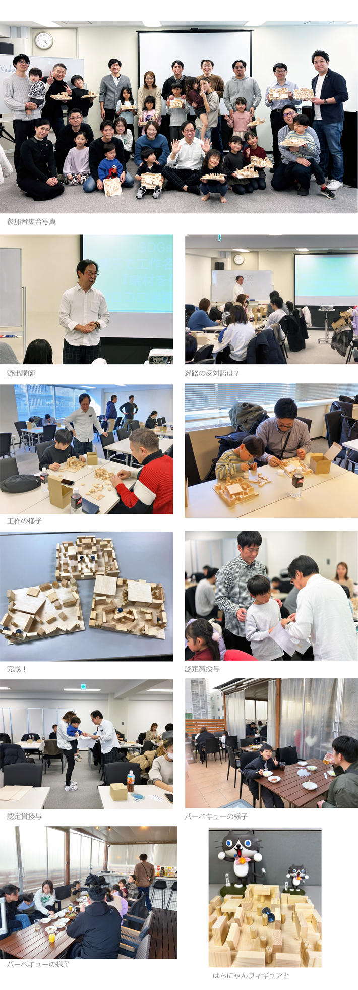 工作体験終了時には、野出先生より参加者へ「工作の達人認定証」が授与されました。参加者からは「本来捨てられるはずの木材が、自由な発想で素敵なおもちゃに生まれ変わる楽しさを実感した」「木工用ボンドの接着力の速さに驚き、工作に没頭できた」といった声が上がり、大人も子供も夢中になって取り組んでいました。